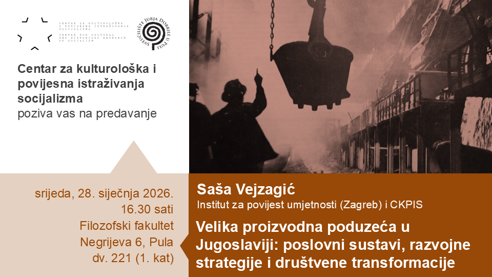 U organizaciji CKPIS-a – u srijedu, 28. siječnja 2026., u 16.30 sati u dv. 221 na Filozofskom fakultetu (Negrijeva 6, prvi kat) – gostujuće javno predavanje pod naslovom Velika proizvodna poduzeća u Jugoslaviji: poslovni sustavi, razvojne strategije i društvene transformacije održao je dr. sc. Saša Vejzagić s Instituta za povijest umjetnosti u Zagrebu.